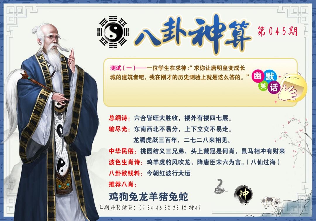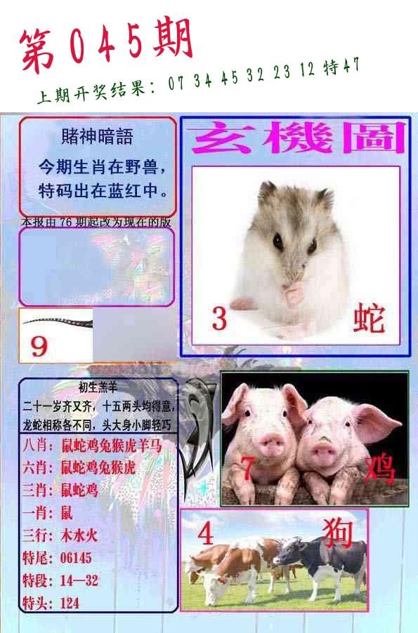 | 045期推荐七肖: 鸡牛兔虎龙猪鼠 -平均压 |